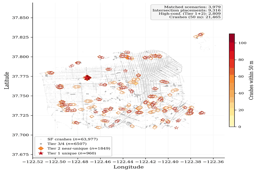 We evaluate the matching pipeline on San Francisco scenarios from the Waymo Open Motion Dataset, where ground-truth intersection locations are available for validation. The hierarchical filtering strategy progressively narrows candidates before computing star pattern distances.